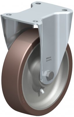 Suporte: Fabricado em aço estampado e reforçado, suporte giratório com garfo pesado e placa de fixação, aparafusada e fixa com pivot central muito estável, com dupla fila de esferas na cabeça giratória, reforçado adicionalmente através de quatro chumaceiras especialmente moldadas, endurecidas, ficando, assim, em particular, resistente aos impactos e choques. Eixo da roda aparafusado. Zincado, passivado a azul, livre de crómio hexavalente. Rodas: Série VSB/GB.Pneus / rasto: Fabricado em elastómero de poliuretano de alta qualidade Blickle Besthane®, 92° Shore A, elevada capacidade de carga dinâmica, castanho, não deixa marcas, é anti manchas.Jante / Corpo da roda: Série VSB: Em aço. Série GB: Fabricado em ferro fundido robusto, a partir da roda Ø 150 mm com bocal de lubrificação, lacado, prateado. Tipo de rolamento: Dois rolamentos de esferas embutidos.