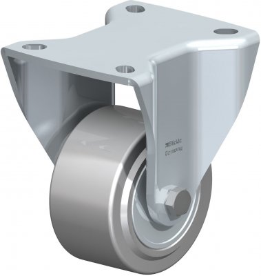 Suporte: Fabricado em aço estampado e reforçado suporte giratório com garfo pesado e placa de fixação, aparafusada e fixa com pivot central muito estável, com dupla fila de esferas na cabeça giratória, reforçado adicionalmente através de quatro chumaceiras especialmente moldadas, endurecidas, ficando, assim, particularmente resistentes aos impactos e choques. Eixo da roda aparafusado. Zincado, passivado a azul, livre de crómio hexavalente. Rodas: Série VSTH. Pneus / rasto: Fabricado em elastómero de poliuretano de alta qualidade Blickle Extrathane®, 92º Shore A, castanho claro, não deixa marcas, é anti manchas. Jante / Corpo da roda: Fabricado em aço, com dois rolamentos esferas embutidos. Rodas: Série SPO: Fabricado em nylon 6 de alta qualidade, resistente à rutura, muito robusto, versão pesada, 70º Shore D, branco natural, com casquilho liso ou dois rolamentos esferas embutidos. Série GSPO: Fabricado em nylon fundido de alta qualidade, resistente à rutura, duro e altamente compactado, 80º Shore D, bege natural, com dois rolamentos esferas embutidos. Série SVS: Fabricado em aço temperado, com rasto ligeiramente convexo, com dois rolamentos de esferas embutidos.